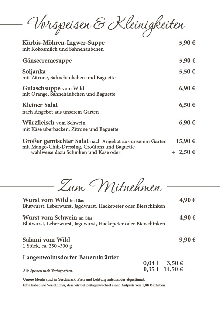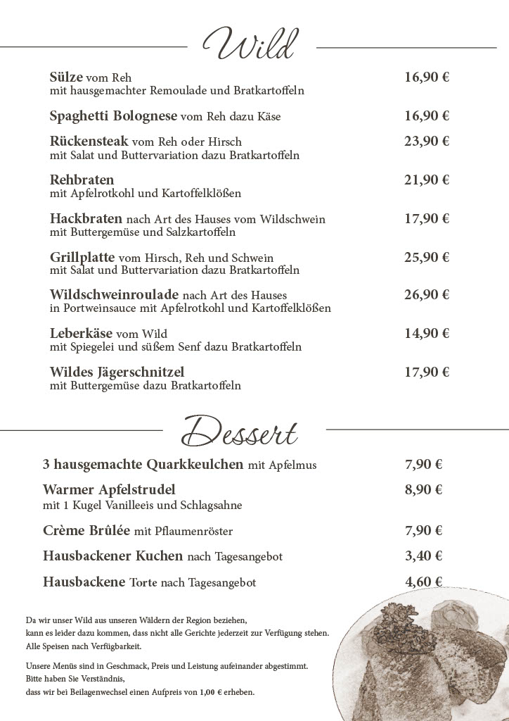 Hinweis: Da wir unser Wild aus unseren Wäldern der Region beziehen, kann es leider dazu kommen, dass nicht alle Gerichte jederzeit zur Verfügung stehen. Alle Speisen nach Verfügbarkeit.